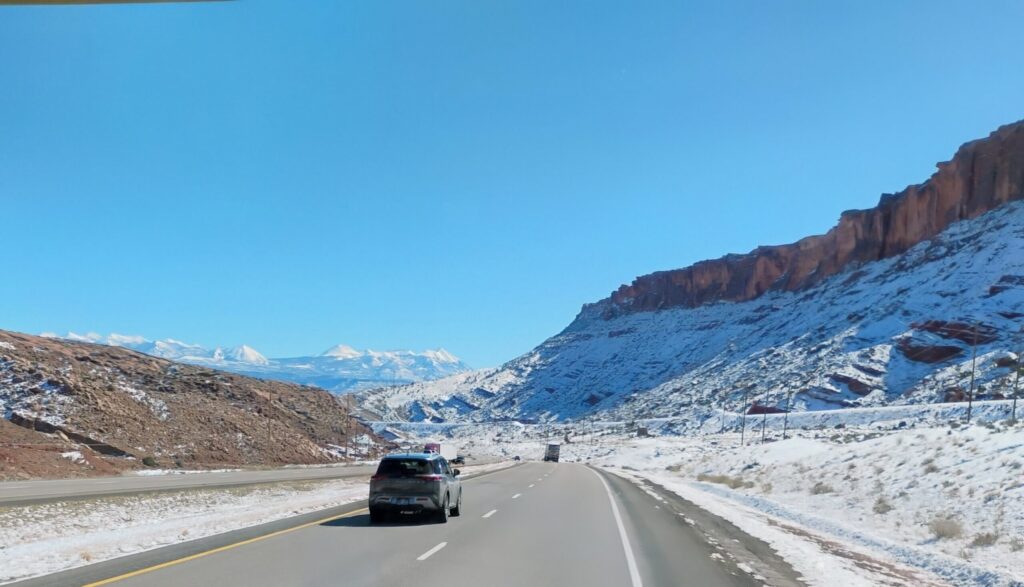 The snow around our place was gone by Thursday afternoon, so we got packed up yesterday and hit the road this morning. The roads were clear, but there was snow on the sides all day today.